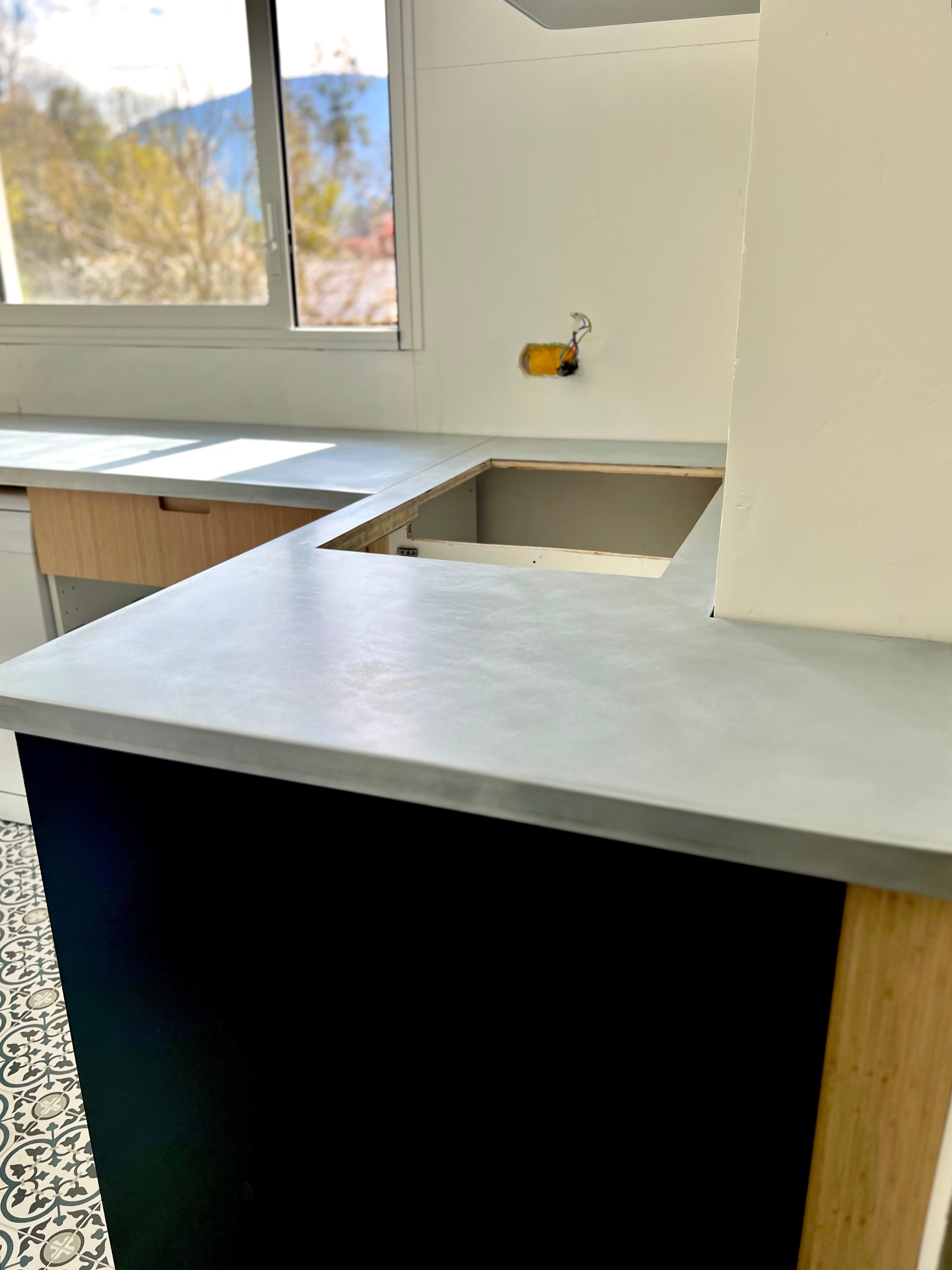 Ce plan de travail entièrement sur mesure a été conçu en plusieurs parties en atelier afin de faciliter la logistique et la pose. Cela a permis d’adapter la pièce sur place afin d’obtenir un assemblage optimal.