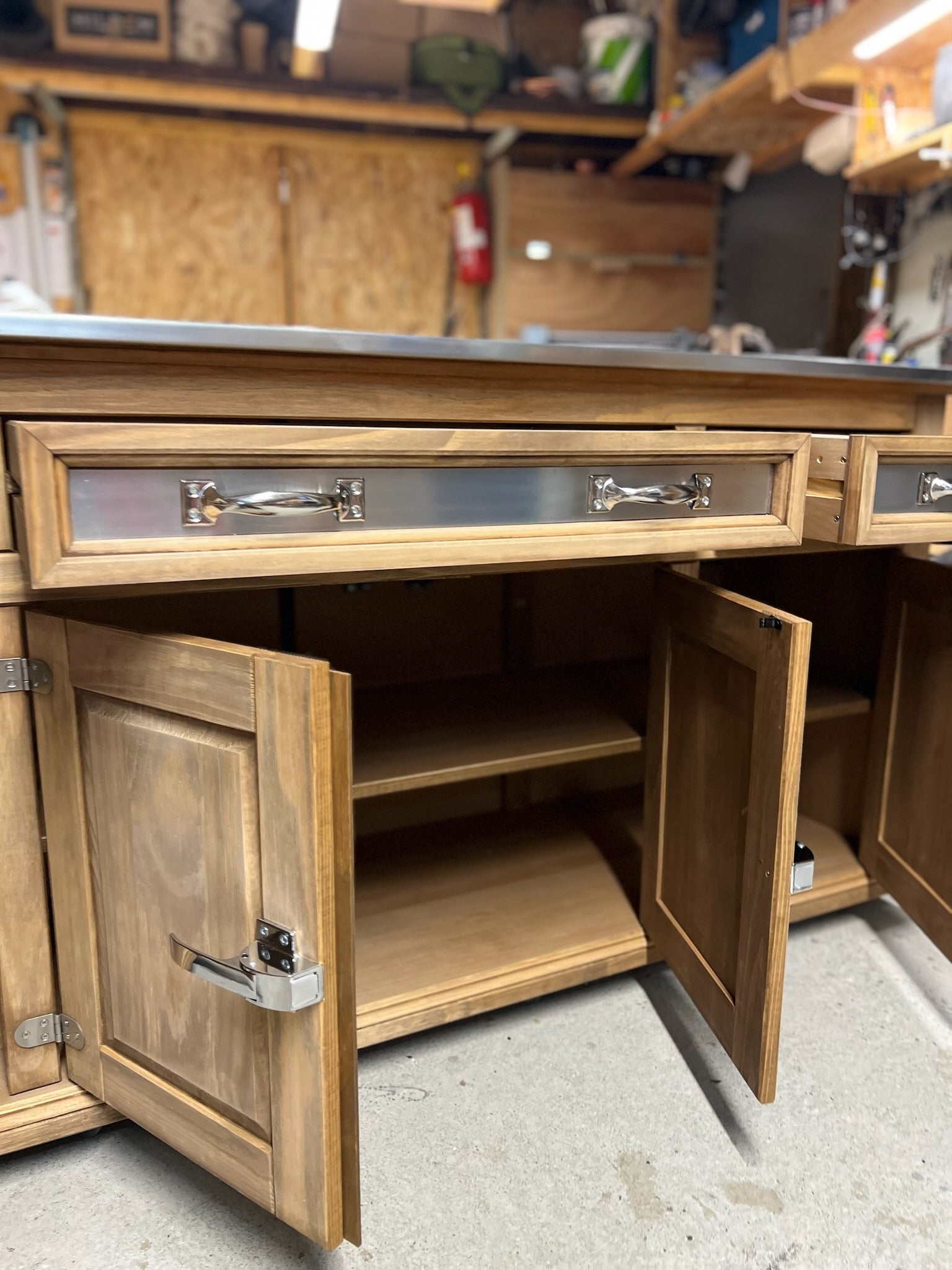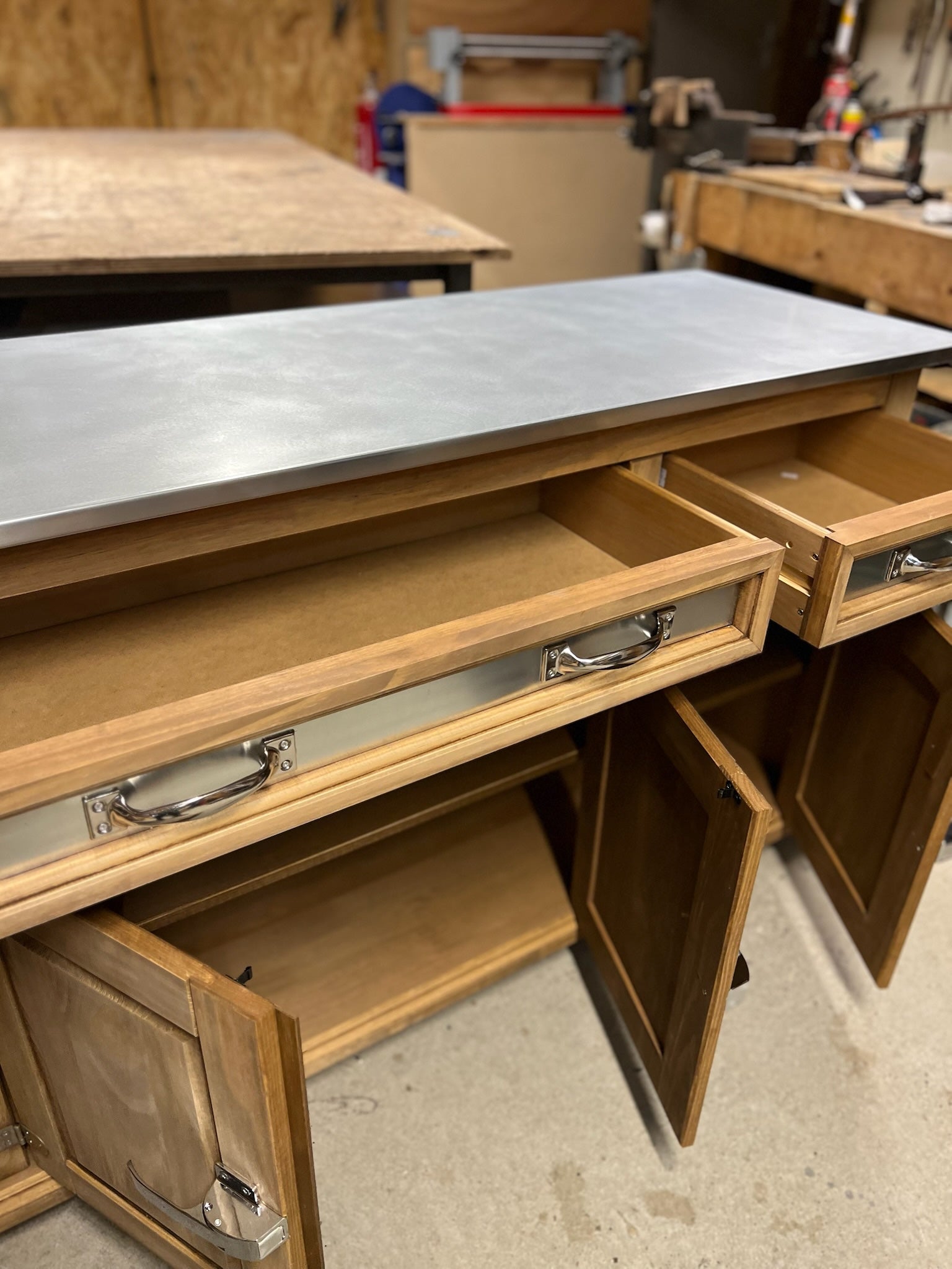 Le buffet en pin massif, avec ses poignées et charnières de portes en inox type glacière de bar. Des poignées inox sur les tiroirs, ainsi que son plateau et ses façades de tiroirs en zinc haut de gamme finition luxe (mate).