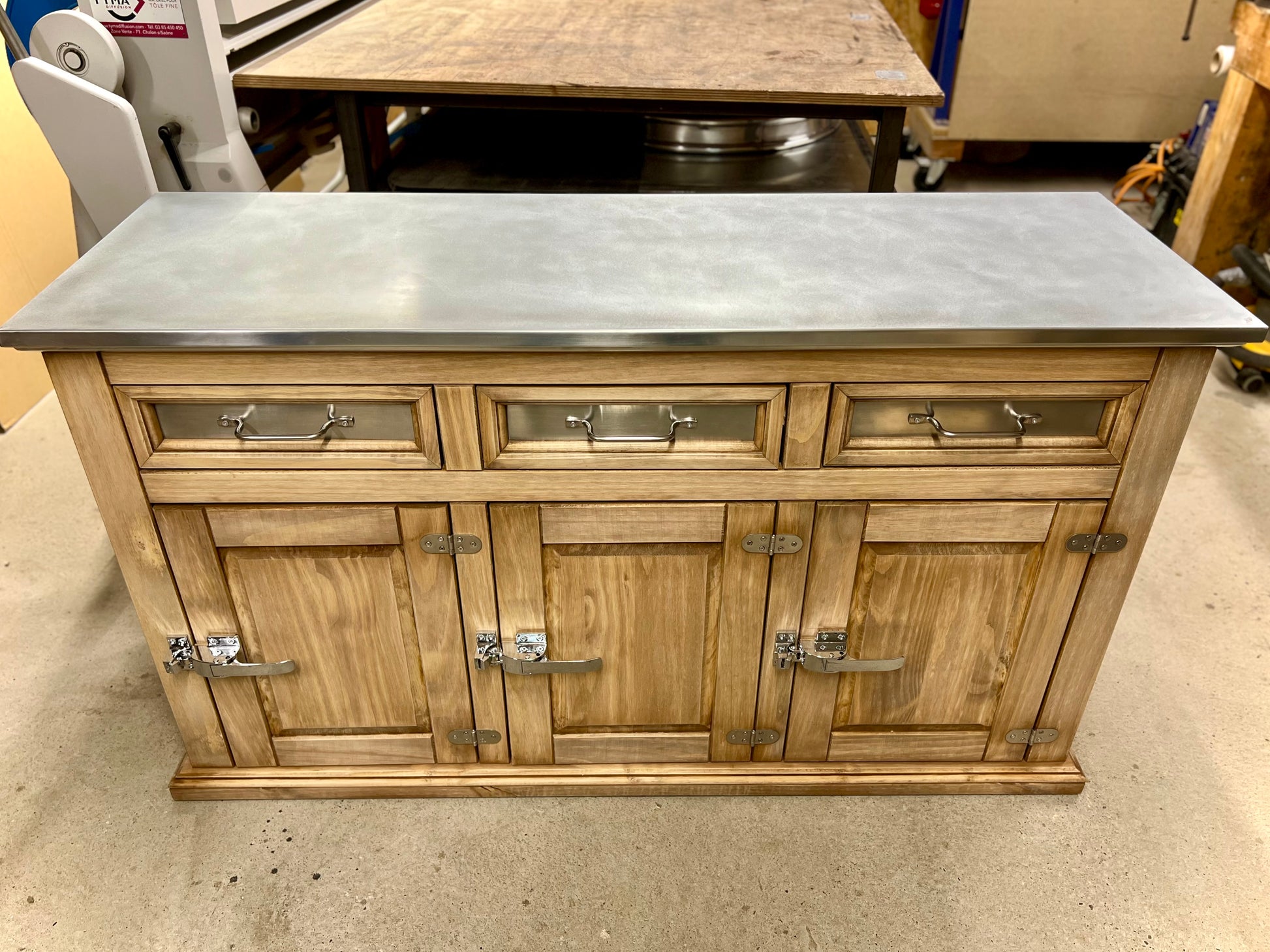 Le buffet en pin massif, avec ses poignées et charnières de portes en inox type glacière de bar. Des poignées inox sur les tiroirs, ainsi que son plateau et ses façades de tiroirs en zinc haut de gamme finition luxe (mate).